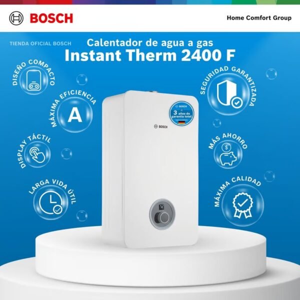Mejor experiencia usando un calentador de 1 sola perilla y display digital exclusivo diseño Roundagon BoschSensor Inteligente de flujoIdentifica fácilmente fallas que afecten el equipo con su Sistema de AutodiagnósticoMáxima durabilidad debido a su intercambiador 100% en cobreSelector de potenciaAgua caliente al instante y de forma ilimitadaPosee botón de encendido y apagado permitiendo desactivar el calentador sin necesidad de cerrar el suministro de gas.Incluye ducto de evacuación.Ventilador integrado que expulsa los gases de la combustión para instalación en viviendas sin ducto comunal.