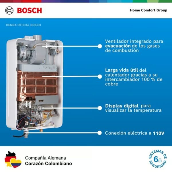 Posee botón de encendido y apagado permitiendo desactivar el calentador sin necesidad de cerrar el suministro de gas;Uso continuo ilimitado (Sin auto apagado);Intercambiador de calor 100% en cobre que prolonga la vida útil del calentador;Diseño Europeo;Posee 7 sistemas de seguridad;Display integrado para visualizar la temperatura de salida;Rápido encendido y calentamiento del agua;Ventilador integrado para la expulsión eficaz de gases.